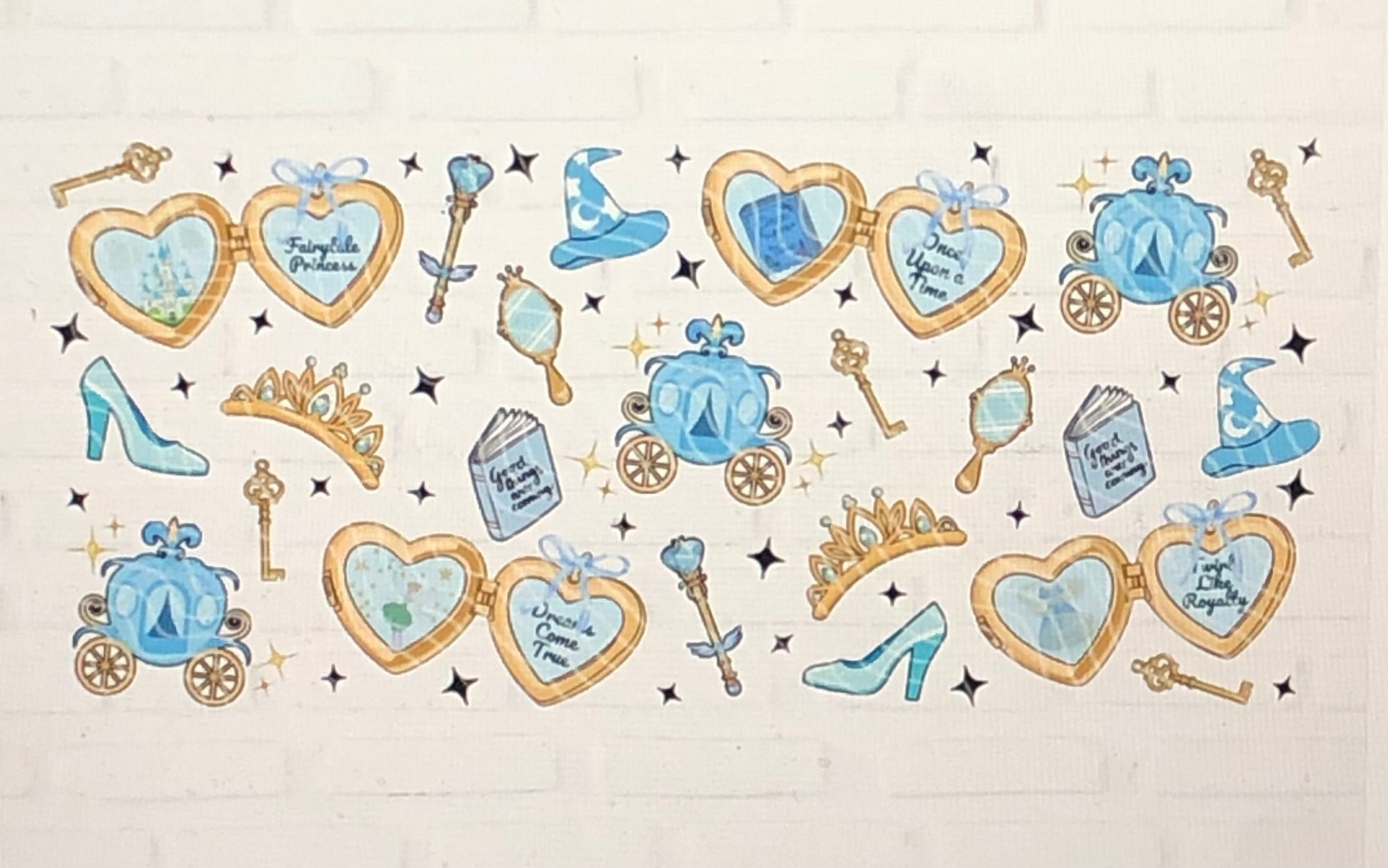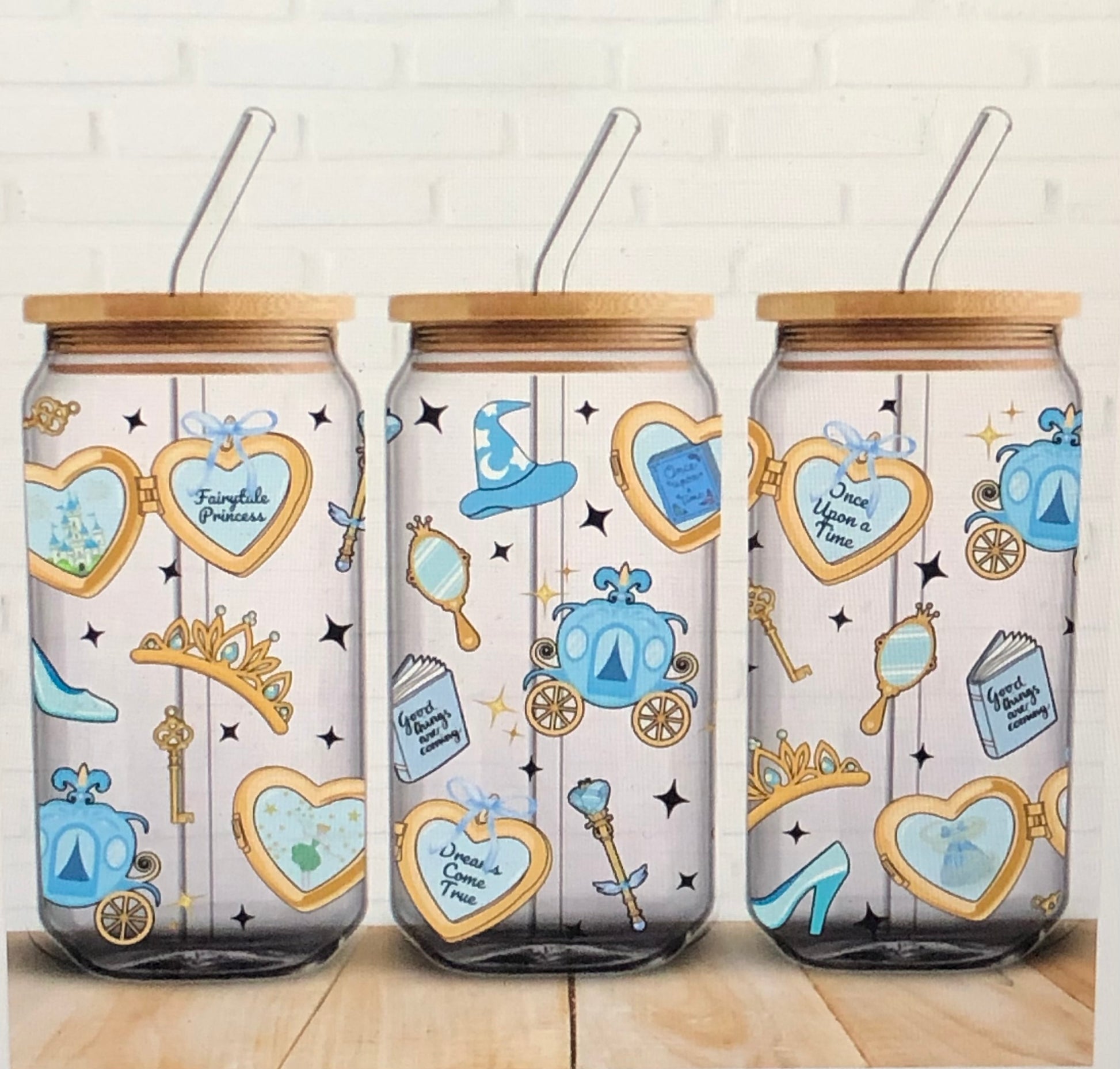 This Fairytale Princess Glass Tumbler is perfect for anyone who loves whimsical, storybook-inspired designs. Adorned with enchanting details like glass slippers, tiaras, carriages, and spell books in dreamy pastel blue and gold tones, this cup is the ultimate companion for your favorite beverages.
