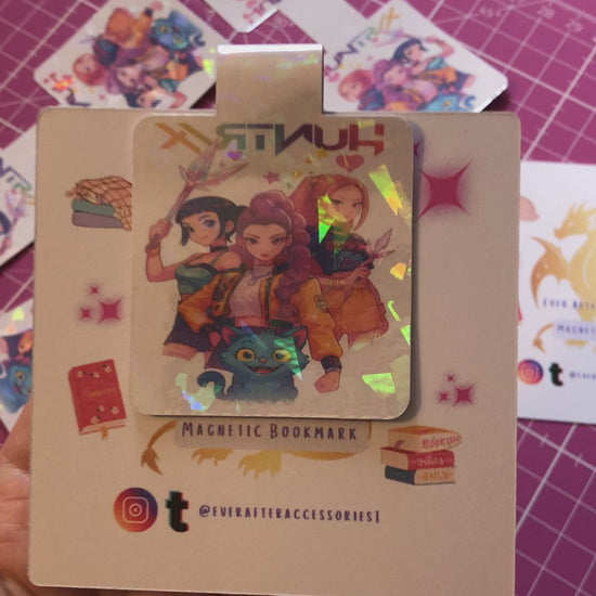 This stylish bookmark features bold, vibrant artwork of the Popular & fierce demon hunter Girls with a holographic finish that shimmers in the light—perfect for fans of K-pop, anime, and fantasy aesthetics. The strong magnetic closure keeps your page secure without damaging your book, making it both cute and practical!